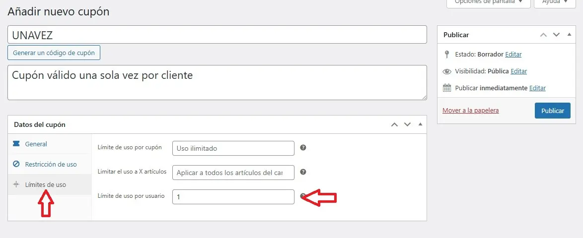 En la misma pestaña Límites de uso, también puedes definir un límite de uso total del cupón.