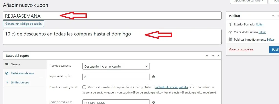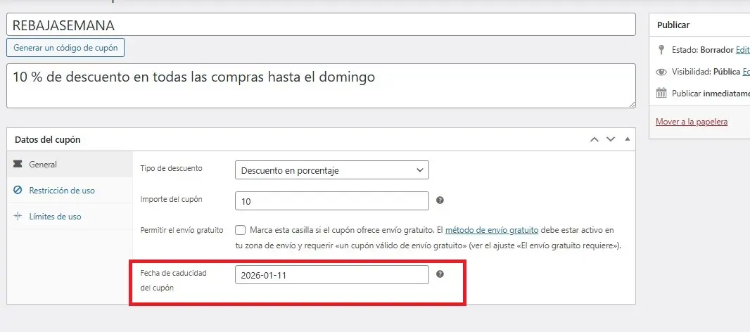 Todo eso se haría en la pestaña Restricciones de uso, pero no es imprescindible para un cupón con fecha de caducidad simple. Sin embargo, antes de publicar este cupón, conviene tener en cuenta lo siguiente: