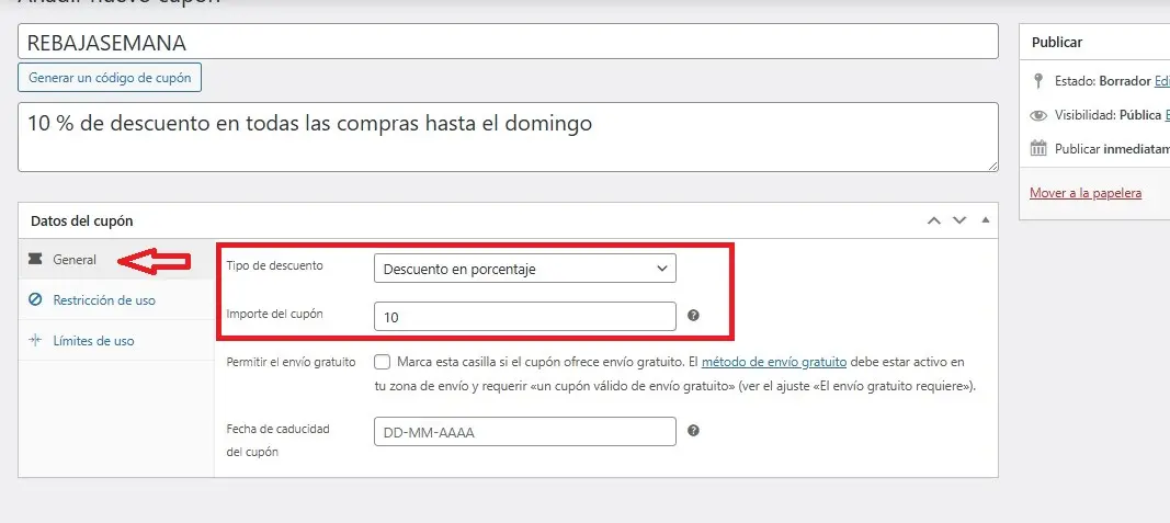 Seguimos en la pestaña General, que es la primera que aparece al editar el cupón.
