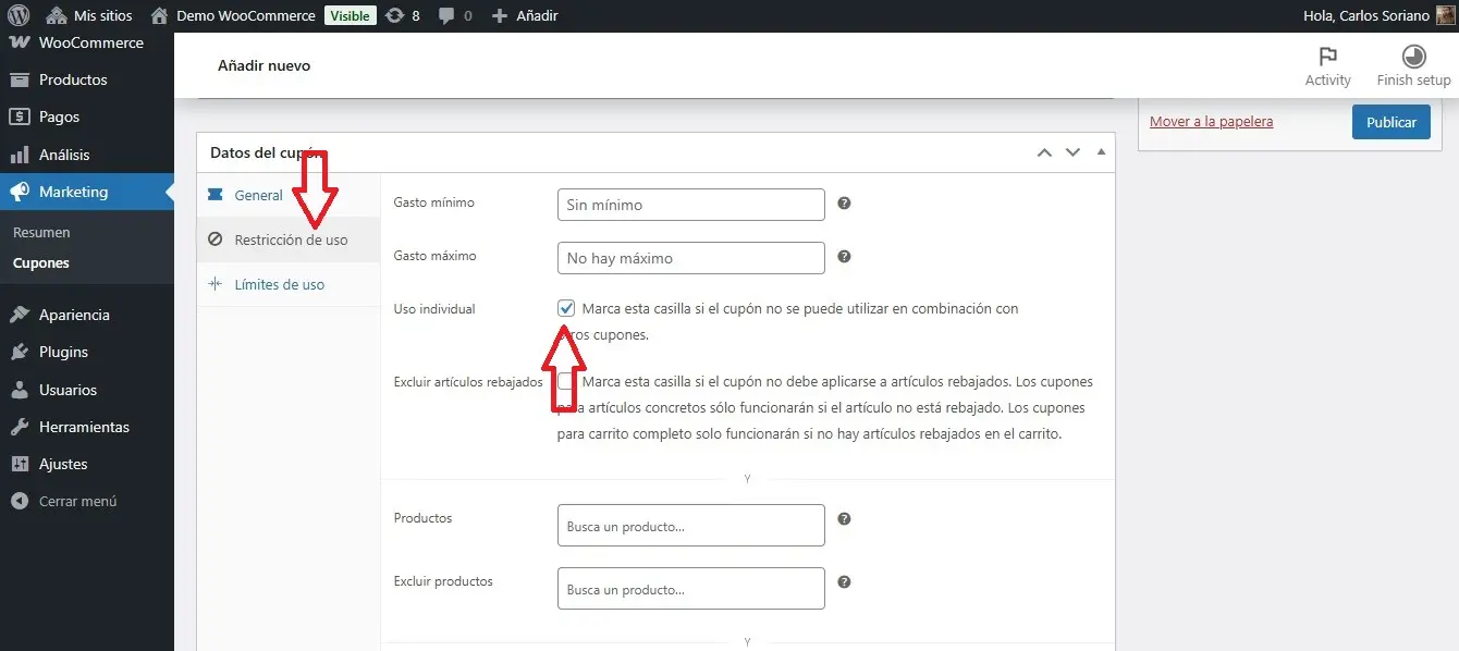 En este ejemplo solo hemos activado el uso individual del cupón. Esto implica que: