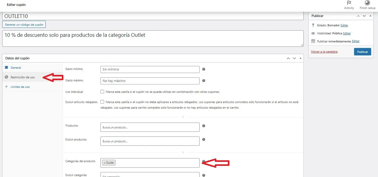 Paso 3: limitar el cupón a una categoría de productos (pestaña “Restricciones de uso”)